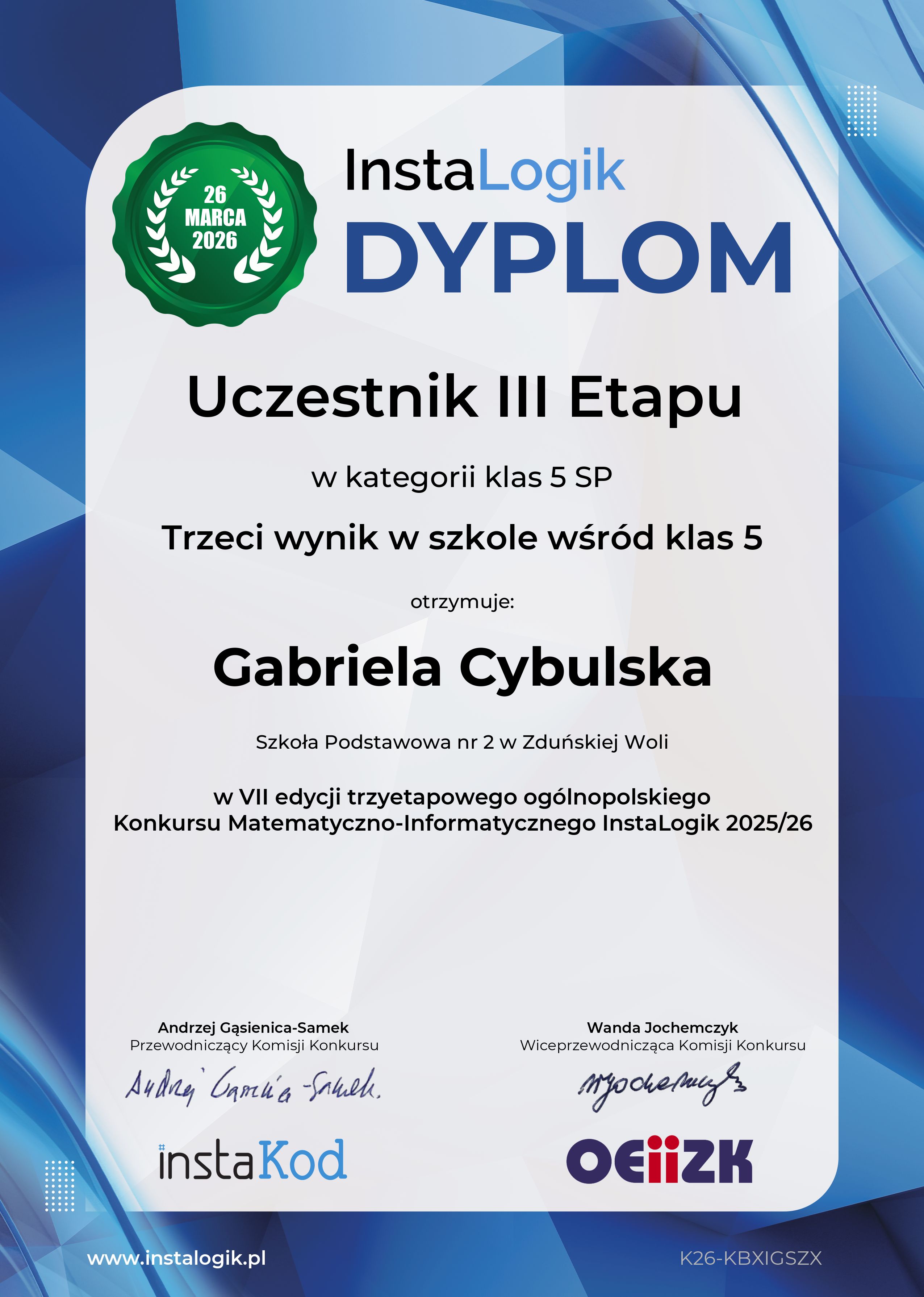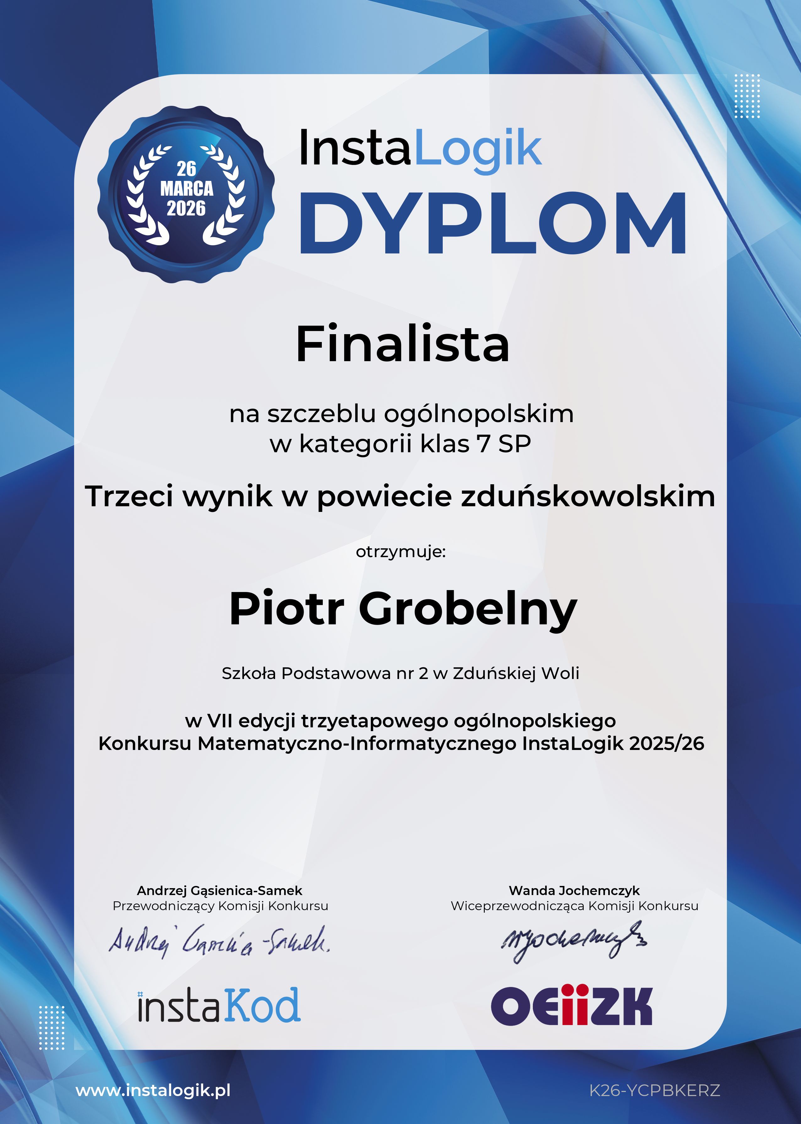 Z ogromną radością informujemy, że uczniowie naszej szkoły zostali finalistami VII ogólnopolskiego Konkursu Matematyczno-Informatycznego InstaLogik 2025/26.