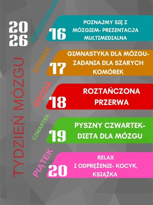 W naszej szkole się nie nudzimy, a każdy dzień jest ciekawym wyzwaniem. Panie Magdalena Marszałkowska i Iwona Kowalska przygotowały dla wszystkich plan działań związanych z projektem "Tydzień pracy z mózgiem". To był pracowity czas, ale na zakończenie, w piąteczek, zaplanowano relaks, książkę i kocyk. To tez sprzyja pracy mózgu. Najwięcej o tym, co się działo powiedzą zdjęcia. Oglądajcie.