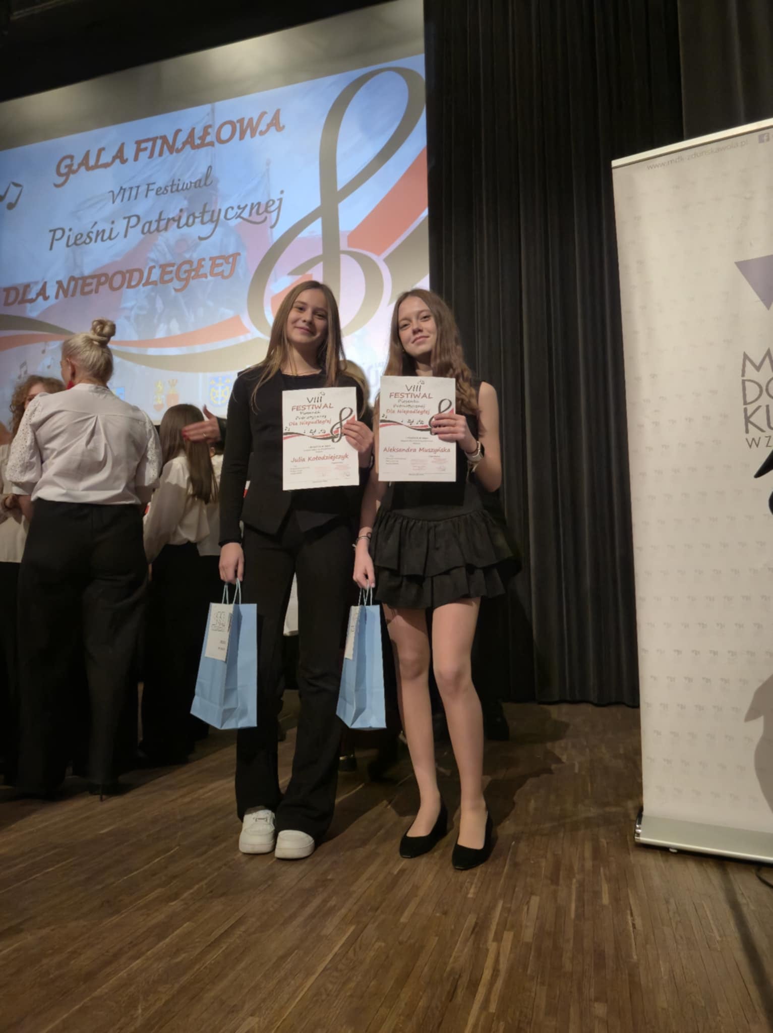 Nasze mądre i zdolne uczennice - Julia Kołodziejczyk i Aleksandra Muszyńska, przygotowane przez równie utalentowaną panią Martynę Łaniewską, zdobyły dwa równorzędne pierwsze miejsca VIII Festiwalu Pieśni Patriotycznej Dla Niepodległej! Brawo.